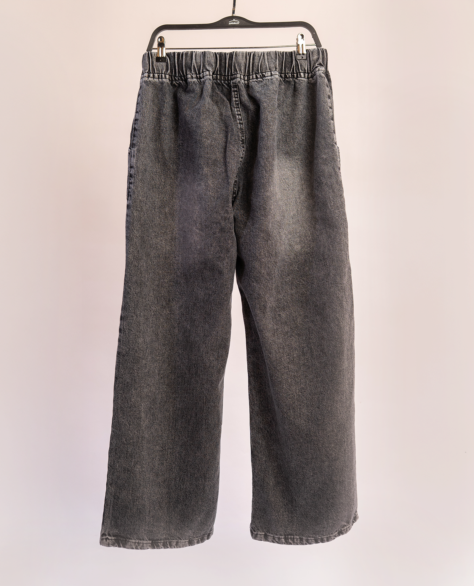 Washed grey denim pants with a vintage-inspired loose fit. Made from durable cotton fabric with an elastic waistband for comfort and versatility. A go-to piece that pairs perfectly with oversized tops and sneakers.